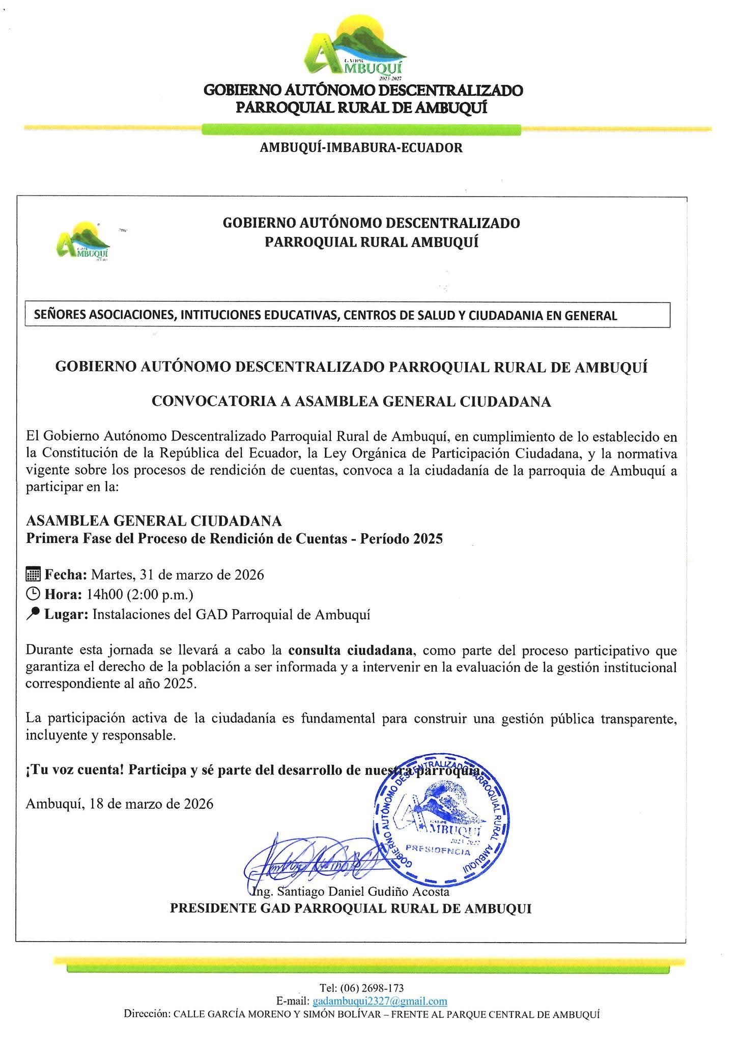 El GAD PR. Ambuquí, convoca a la ciudadanía en general perteneciente a la parroquia de Ambuquí a la Asamblea General Ciudadana, dando cumplimiento a lo establecido en la ley, a la Primera Fase de del Proceso de Rendición de Cuentas, periodo 2025.
